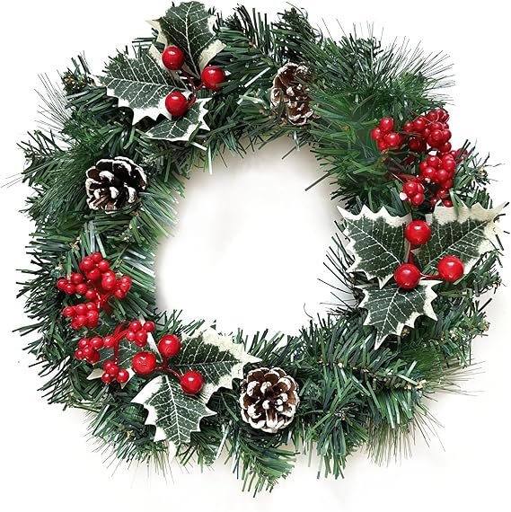 40cm Artificial Spruce and Pine Christmas Wreath With Holly, Berries & Pine cones.
